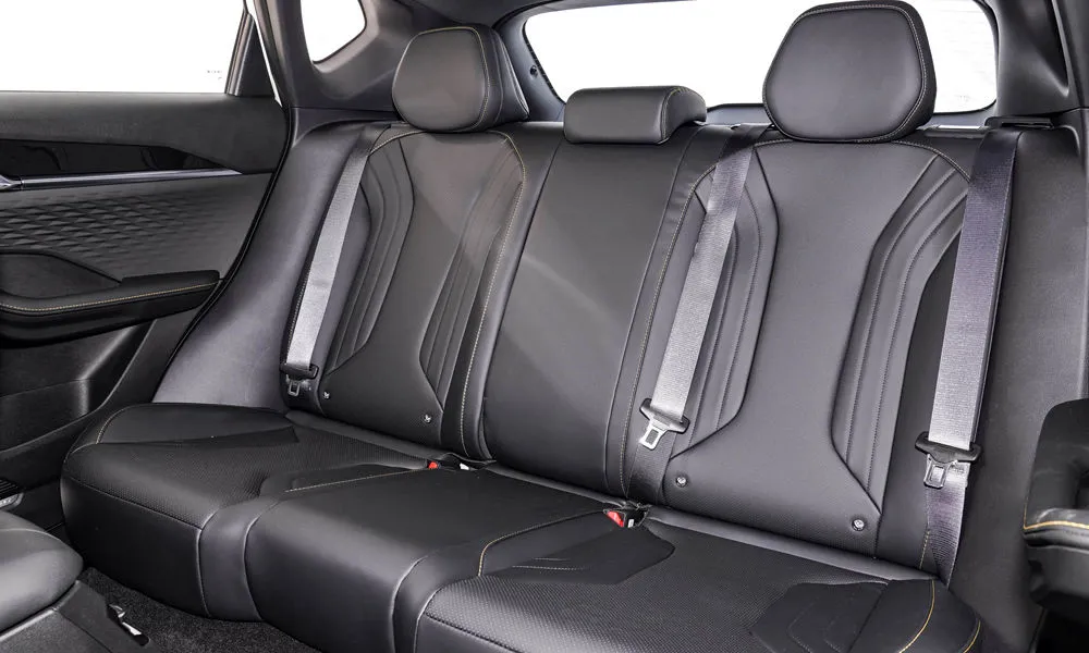 Отделка интерьера и сидений экокожей с замшевыми вставками чёрного и красного цвета